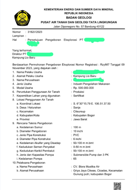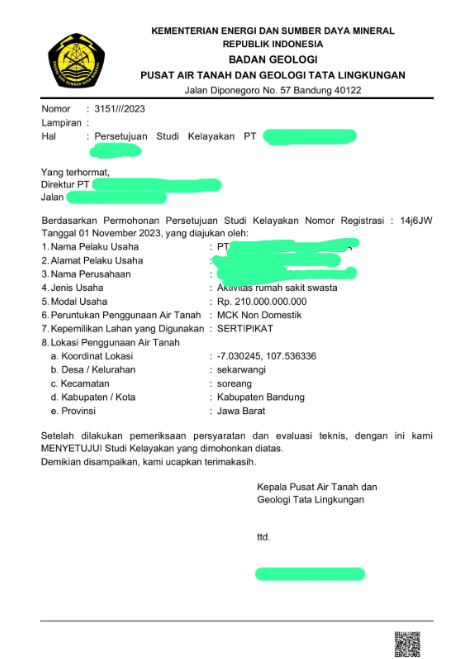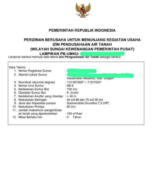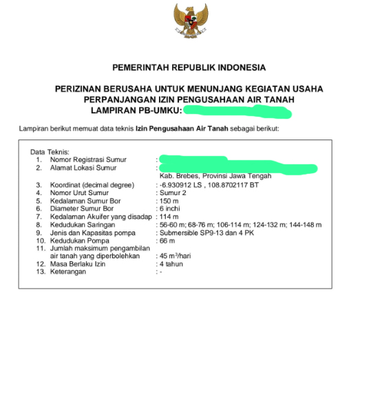 Pastikan surat ini sudah Anda miliki (NIB KBLI). Surat tersebut juga harus sesuai dengan rencana pelaksanaan kegiatan pemakaian air tanahnya.